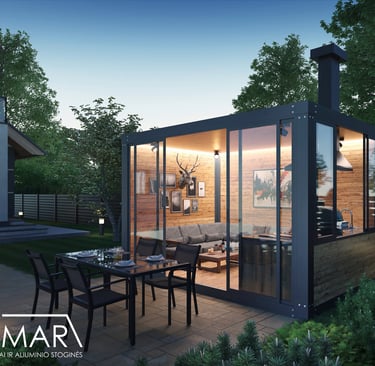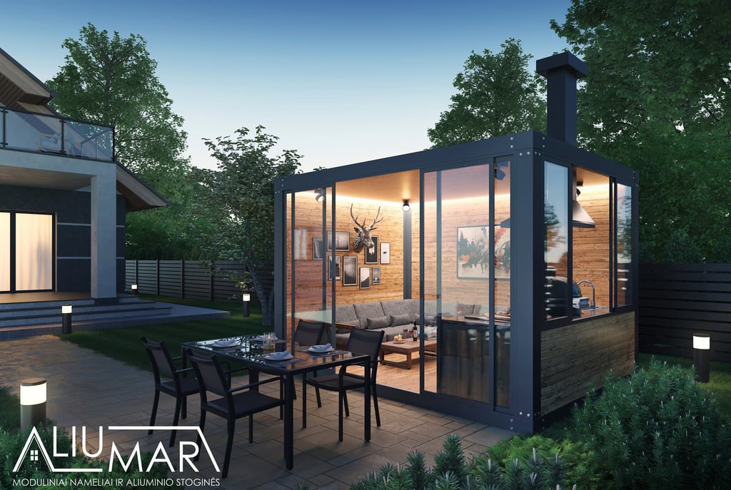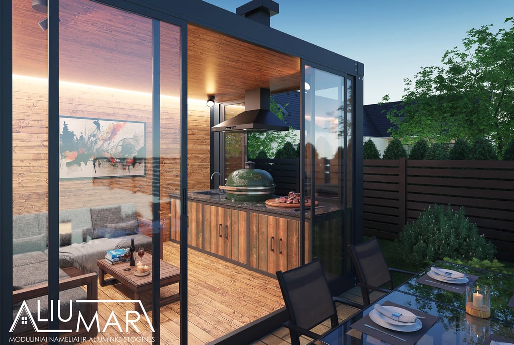 Tvirtas metalas, atsparus įvairioms oro sąlygoms. Stogui naudojamas medžio karkasas, OSB plokštės su prilydoma bituminė danga. Grindys daromos iš impregnuotos medienos ir terasinių lentų. Pavėsinėje įrengiama aliuminio profilio stumdoma sistema.